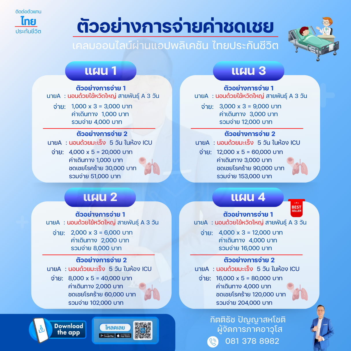 2. ผลประโยชน์กรณีเข้าพักรักษาตัวในห้องผู้ป่วยหนัก (ICU) ค่าชดเชยรายวัน X 4 (บริษัทจะจำกัดการจ่ายผลประโยชน์ให้ไม่ เกิน 365 วันต่อการเข้าพักรักษาตัวครั้งใดครั้งหนึ่ง)